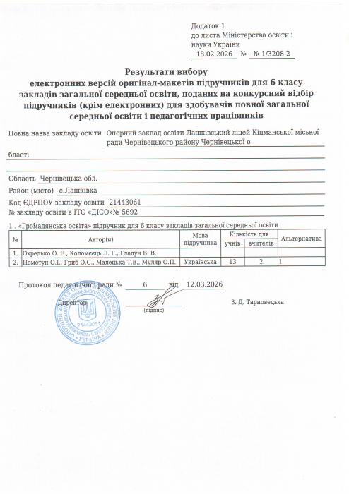 Результати вибору електронних версій оригінал-макетів підручників для 6 класу закладів загальної середньої освіти, поданий на конкурсний відбір підручників(крім електронних) для здобувачів повної загальної середньої освіти і педагогічних працівників